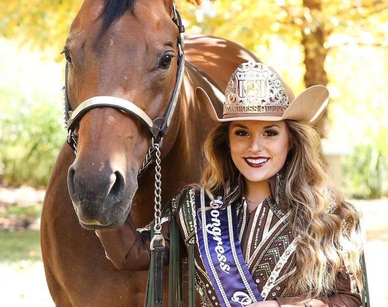 Now that she has won, she enjoys getting to travel and help advance the equine industry.“My favorite part of being Congress Queen has been having the platform to excite the future of the equine industry–the youth,” she says. She has “traveled to youth leadership conferences to speak and has been able to present awards to hardworking young horsemen and horsewomen in our industry.”